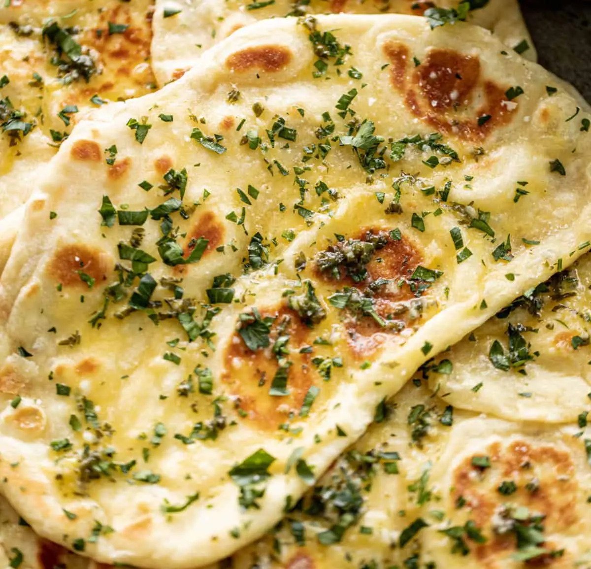 Garlic Naan: Naan brushed with garlic butter and garnished with fresh coriander.